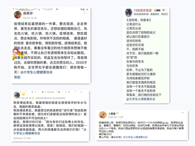 此次活动吸引了公司不同年级200余名员工参加,每一位参与的同学都认真准备,热情投入。在“战‘疫’情,不虚度”运动分享环节,同学们通过拍摄在家锻炼的运动小视频,营造阳光健康的氛围,展现乐观向上的精神风貌;在“小口罩,大创造——口罩DIY大赛”中,同学们通过巧妙构思,将原本用于隔离病毒的口罩加上了一层温暖的问候,为心灵戴上一面坚实的防护,拉近彼此的心理距离;在“疫情之后,梦你之想——我想对TA说”分享活动中,同学们敞开心扉,写下自己疫情结束后最想做的事、最想见的人和最想对TA说的话,用见字如面的特殊方式加强人际沟通,感受文字的深情;在“逆境携行,你我同心”小视频制作大赛中,同学们通过记录疫情期间的所思所想,勇敢说出内心感悟,表达出大家众志成城,同心抗疫的坚定信念;在不“疫”样海报大赛环节,同学们精心设计抗疫海报,赋予无声的图文最响亮的青春口号;在“疫”表情,抗疫情——表情包设计大赛中,同学们用简单表情包的形式表达出疫情期间所体会到的各种复杂情绪,将消极的情绪体验设计成诙谐的文字表情,将笑容传递你我。