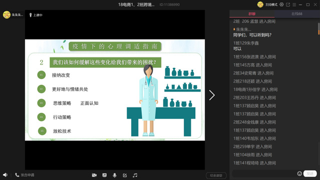 两位主讲人依托心理健康的专业背景优势,前期通过组建心理委员交流群,及时了解新冠疫情期间广老员工心理健康方面所存在的一些问题,通过集体备课,认真做好线上心理健康讲座的各项准备。讲座首先带领广大同学了解了新冠疫情的发病原理、传播方式和渠道、个人防护措施等问题。紧接着,讲座用通俗的案例引导员工意识到心理防疫在打赢疫情防控阻击战中的重要作用。讲座分析了疫情可能给广老员工带来的情绪变化、生理反应、思维反应和行为反应,并为同学们如何提高个人心理防疫能力支招解惑。最后,讲座给广大同学四点建议:一是理性科学看待疫情,积极做好个人防护,选择权威渠道,做信息的主动搜集者,避免灾难化思维;二是保持良好个人心态,积极调适个人情绪,遇到问题及时与家人、老师沟通,做好焦虑、恐慌等负面情绪的释放排解;三是合理规划居家的学习与生活,养成良好作息习惯,合理控制上网时长,适量开展室内运动。四是充分利用各类网上教学资源,努力培养个人自律能力,提高学习效果,认真完成春季学期的各项在线学习任务。