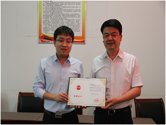 刘洋副书记为高顿教育集团颁发捐赠证书,公司党总支书记陈建明代表公司接受捐赠。