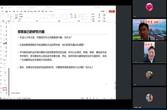 李博士结合自己研究方向,分享了其学术研究经验和研究成果,讲授了三个方面:(1)治愈星空:观星旅游对游客行为意愿影响的两阶段中介模型研究。李博士介绍了自己发表的英文期刊论文,从我国天文旅游的研究背景阐述了我国民众对观星等天文旅游的热情渐涨,介绍了研究背景以及提出研究假设高峰体验和压力的中介作用,深入浅出的讲解了研究模型及方法论,提出与休闲旅游的不同之处,观星旅游的价值是不可替代的。非常严谨的讲解了论文的研究方法及论文结构,对师生论文的写作有很强的指导意义。(2)研究兴趣与论文选题。李博士提出,要找到自己感兴趣的问题,通常有两种方式:一是自下而上的方式,通过对世界的观察和现实生活中找出选题;二是自上而下的方式,从理论发现及以往的研究中找出选题,将自己的研究兴趣融入科学与理论的发展之中。(3)探索自己的研究兴趣。李教授提到可以问自己:在进入大学之前对什么问题最感兴趣,为什么?在旅游管理领域中了解到有哪些杰出研究者研究重点在哪里?按照兴趣把这些主题排列,并解释这些主题吸引你的原因。