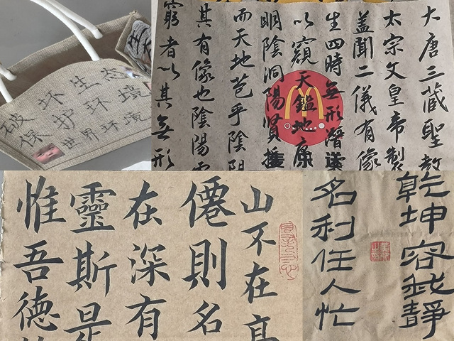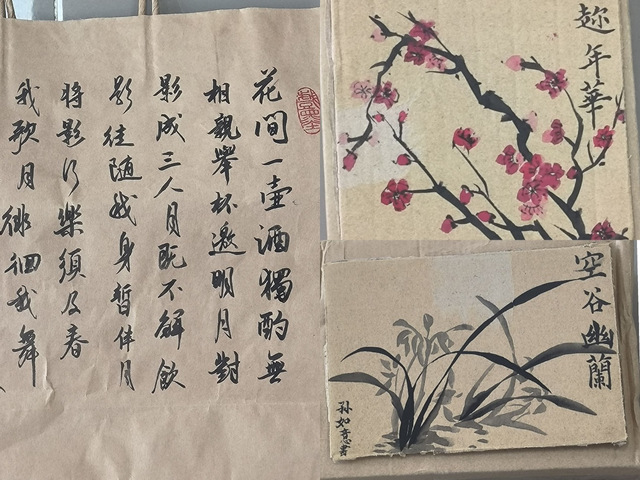 活动期间,收到来自多个公司的多份作品。同学们将环保主题巧妙的体现在书画作品的呈现物上,有在购物纸袋上呈现的,有在快递纸盒上呈现的,还有在麻布提袋上呈现的。同学们喜好的软笔书法字体也各不相同,真、草、隶、篆、行五种字体在必选现场都有出现。除书法形式外,国画形式不在少数,风吹荷花香、空谷幽兰等作品更是让人眼前一亮,环保与艺术在此刻得到完美的结合。