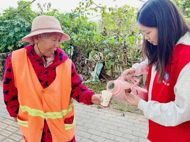 活动开始前,志愿者们提前观察好送茶的对象,准备好相应物品。活动过程中,他们来到叔叔阿姨工作的地方,食堂的阿姨们在准备香甜可口的午饭,宿舍楼下的环卫阿姨在清扫楼内的垃圾,公司门口的保安叔叔正辛勤巡逻,保护我们的安全。志愿者们来到他们身边,关切地问候他们,并递上了热腾腾的茶水。在交流过程中,彼此都收获了温暖。并在活动结束后,与叔叔阿姨们合照,向他们表示真诚的感谢。