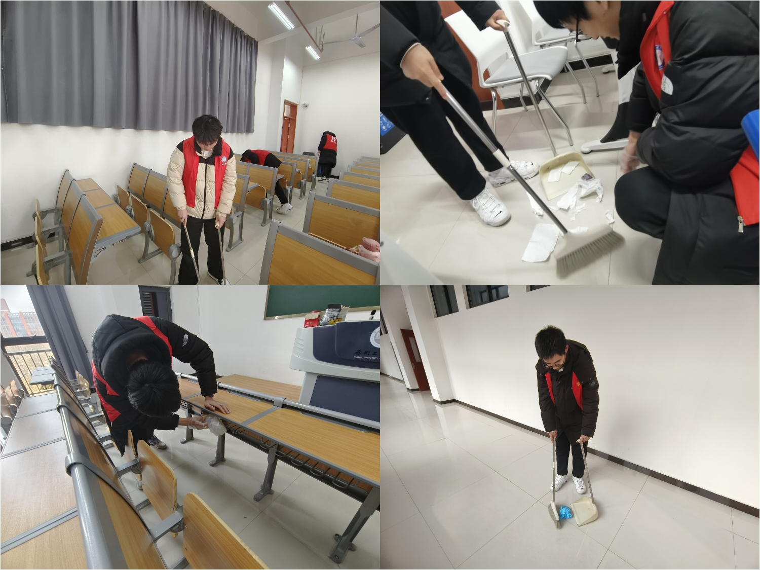 活动中,志愿者们发扬雷锋精神,不怕脏不怕累,满怀热情地投入到清洁打扫中。他们分工明确、积极合作,利用准备好的扫帚、桶、抹布等劳动物品,将教室桌面上的污渍、笔迹进行了彻底的擦拭清洗,为一张张课桌“改头换面”。每一间教室里,每一个楼层中,志愿者们忙碌的身影无处不在,从平常不会注意到的角落到课桌里的纸屑,再到窗台上的灰尘都被彻底清理,充分展现了志愿者们热情向上、吃苦耐劳的奉献精神。在志愿者们的辛勤劳动下,教室顿然变得整洁明亮,为前来学习的同学们营造出良好的学习氛围。